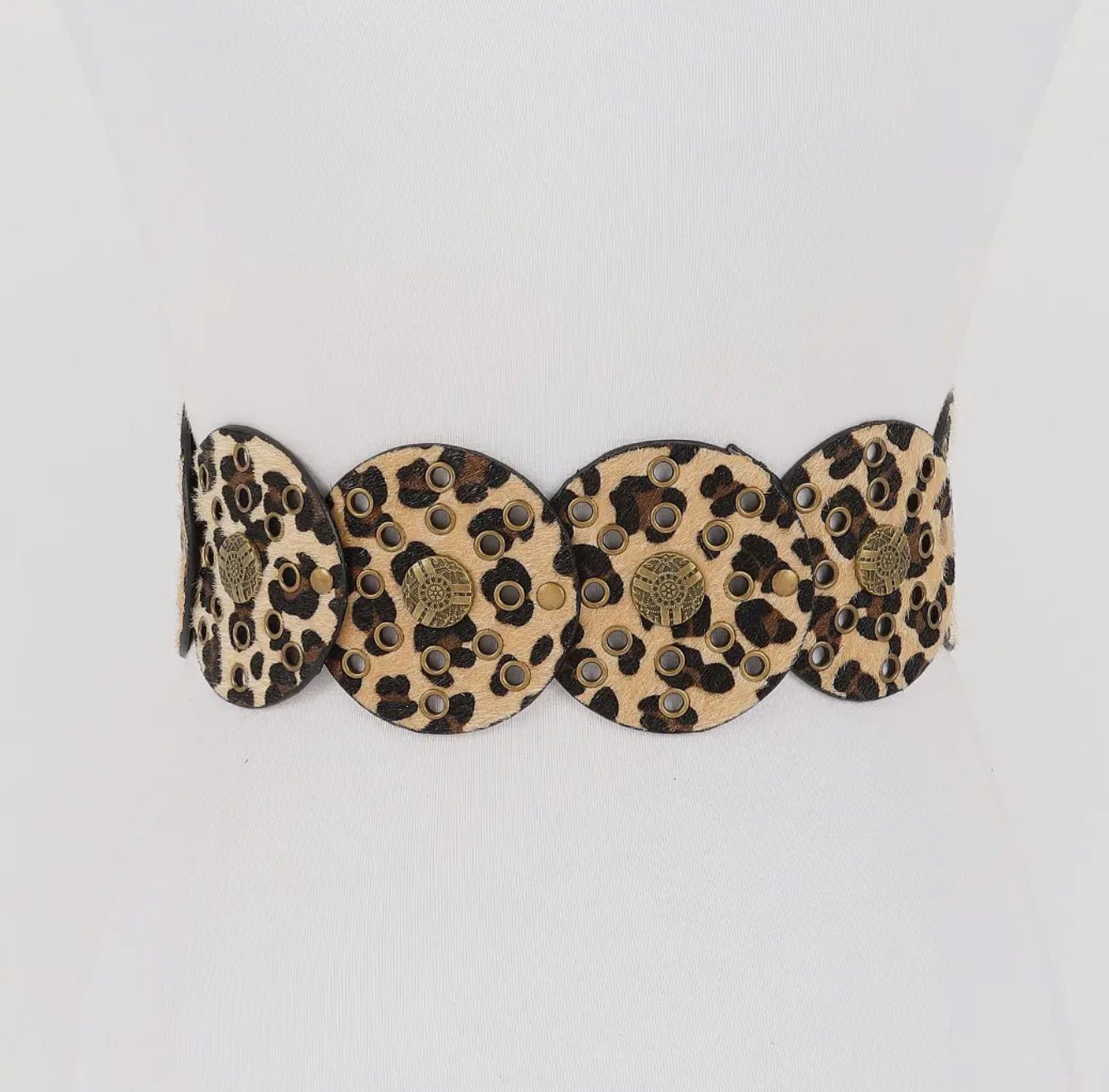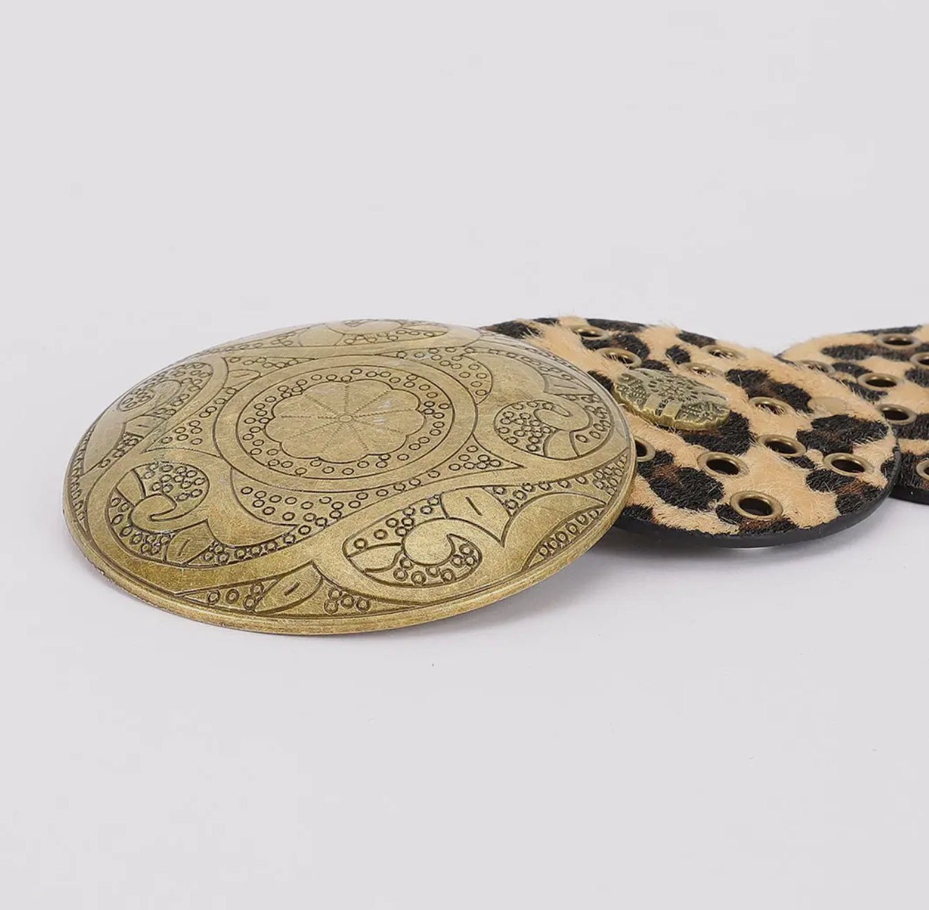 * This Metal Buckle Faux Leather Belt from H&D Accessories has a bold, statement - making design. It features circular, leopard - print faux leather panels adorned with metal studs and a large, ornate metal buckle at the center. The unique, eye - catching style adds a dramatic touch to outfits.