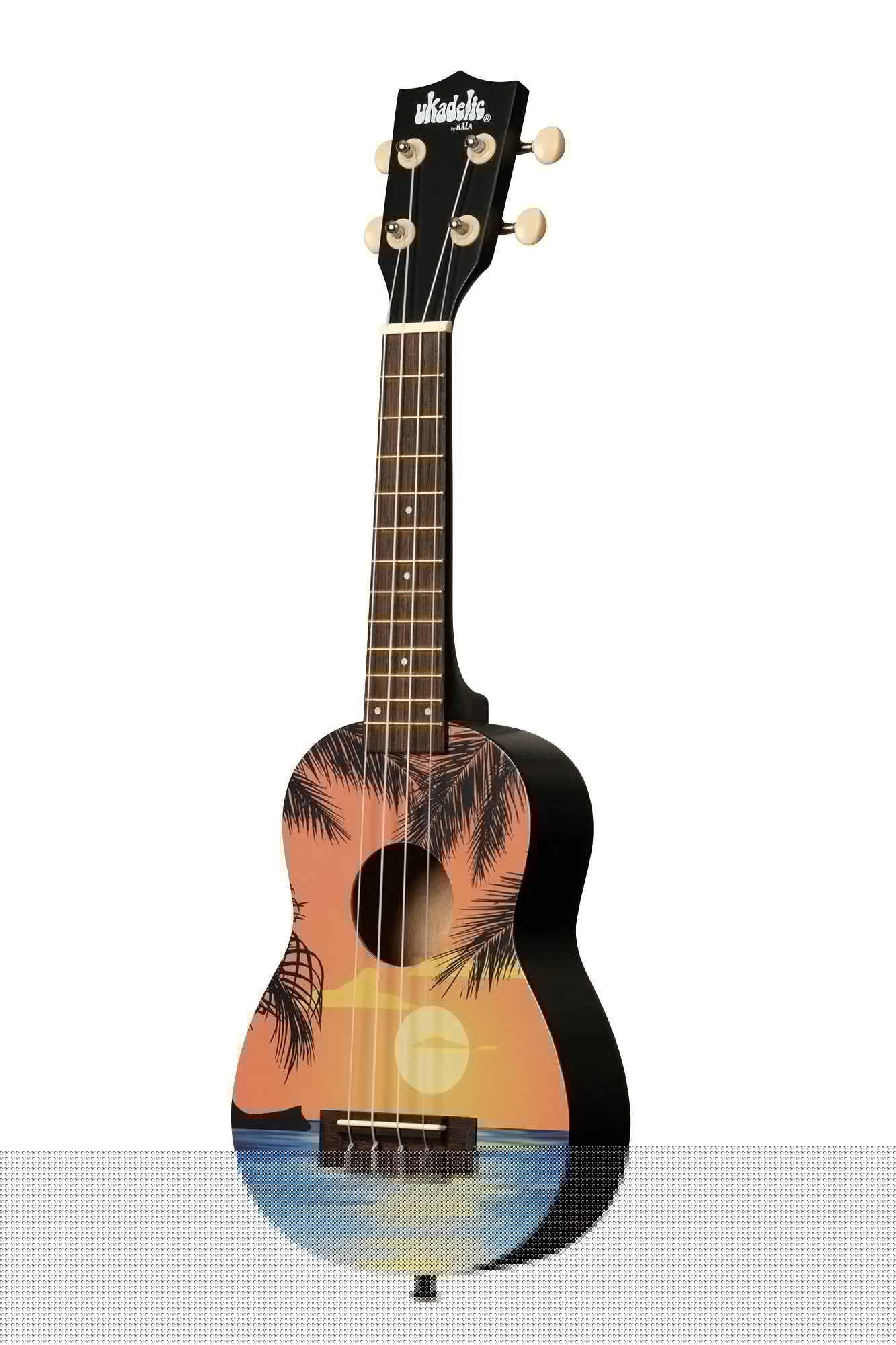 The Tropical Day Ukadelic portrays the quintessential ukulele vibe: palms, shoreline, and a golden sunset over the ocean. Relax and get carried away by the chill island vibes. This design is a newly updated piece we’ve brought back to the Ukadelic collection, paired with painted black back and sides.