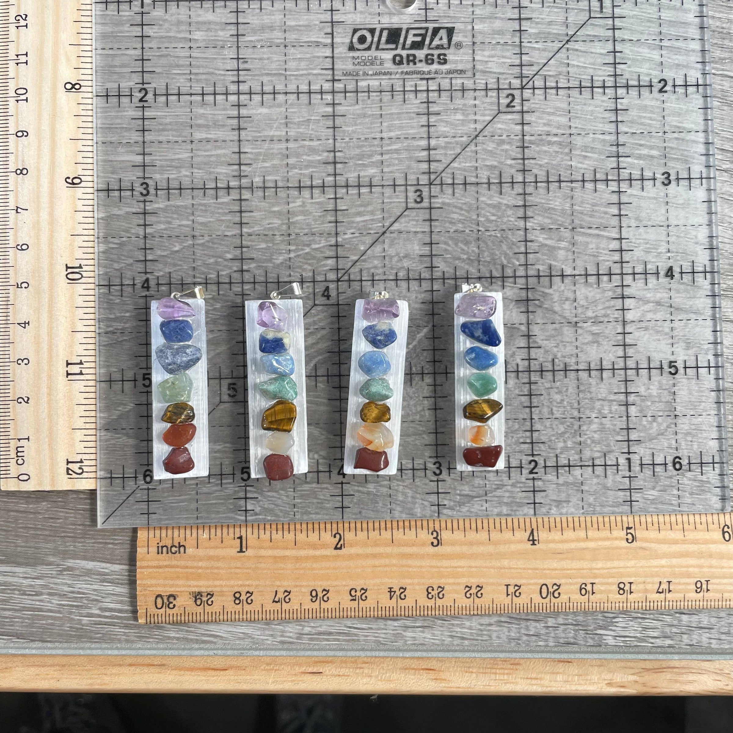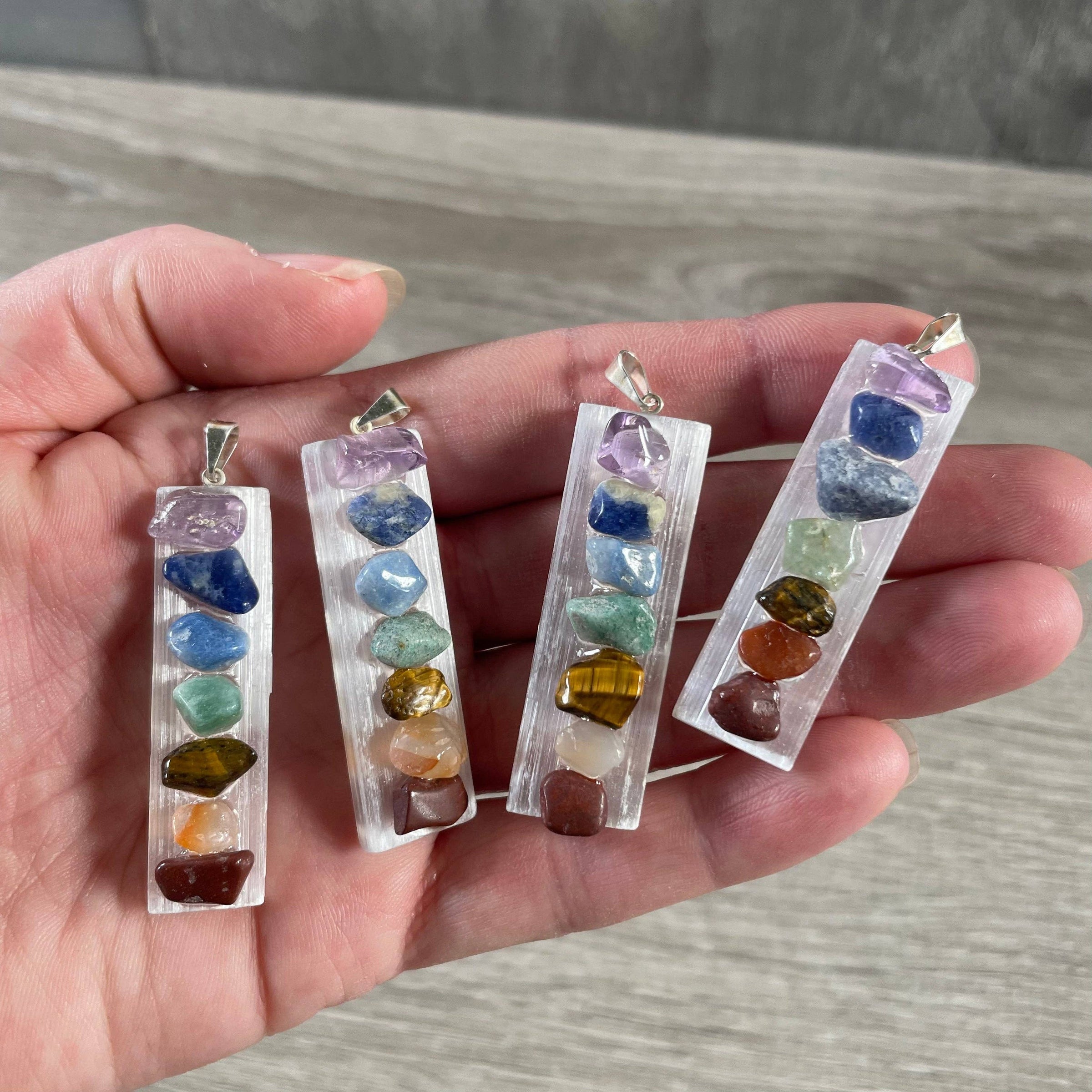 Our Selenite Chakra Pendants are perfect. Accented with colorful chakra symbols, these pendants are designed to align energy centers and support holistic well-being. Selenite’s stone cleansing with the chakra design adds a meaningful touch for those seeking spiritual balance. These pendants are lightweight, versatile, and suitable for everyday wear, making them an ideal choice for metaphysical. With their unique combination of beauty and purpose, these pendants attract a wide audience, from energy practitioners to jewelry enthusiasts. Chakra Stones: Amethyst, Sodalite, Blue Quartz, Aventurine, Tiger Eye, Carnelian, Red Jasper.