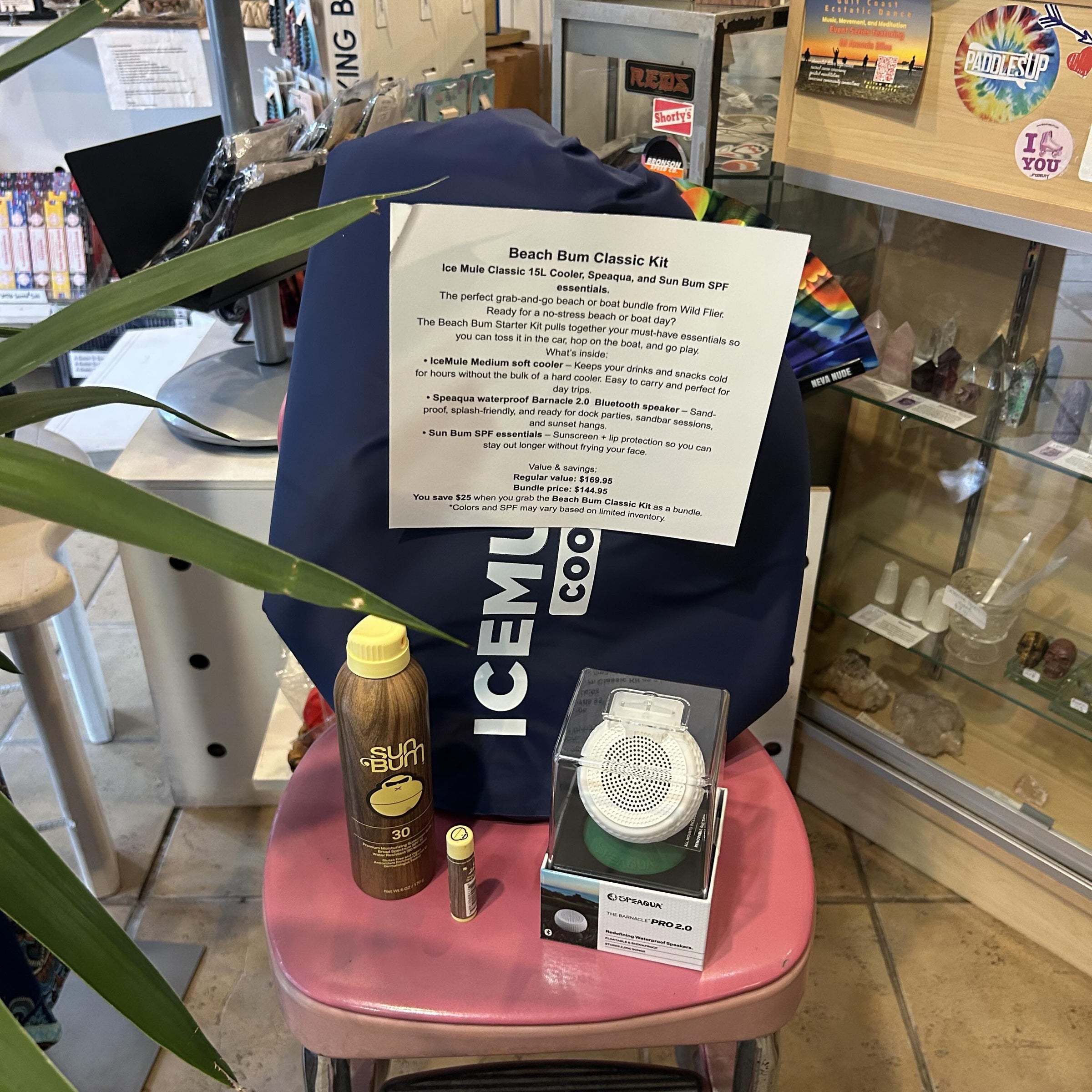 Beach Bum Classic Kit- Ice Mule Classic 15L Cooler, Speaqua, and Sun Bum SPF essentials. The perfect grab-and-go beach or boat bundle from Wild Flier.