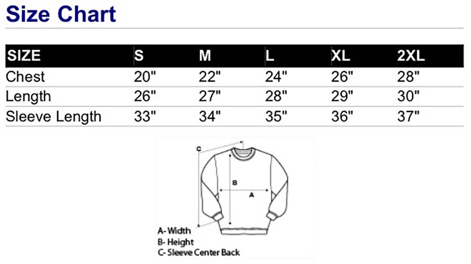 Sizes available are small, medium, large, XL, 2XL and 3XL.
