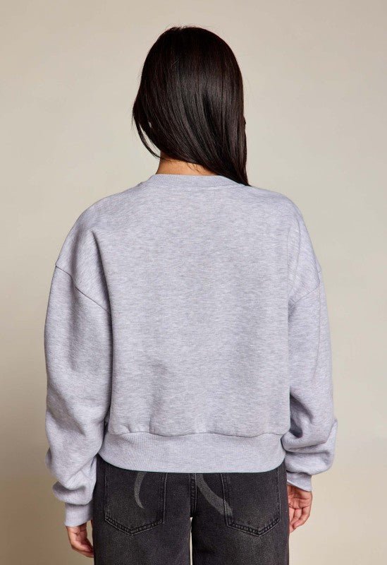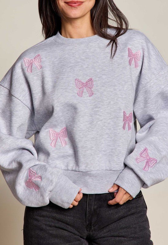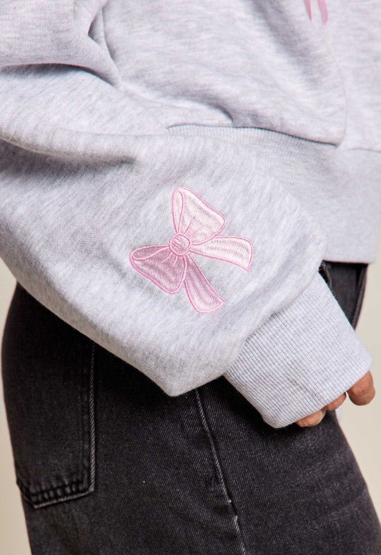 EMBROIDERED ALL OVER BOWS / LS CROP FLEECE CREWNECK SWEATSHIT Model Spec: Height 5'4", Bust 33/C, Waist 26", Hips 34"