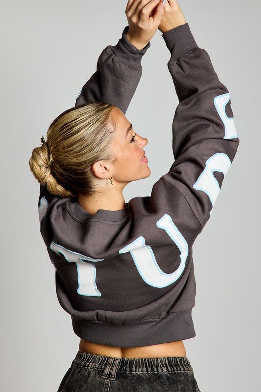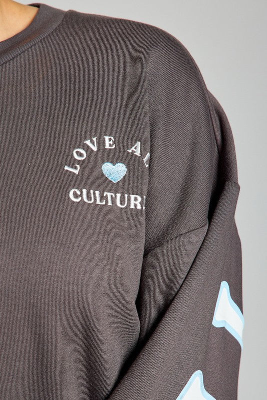 LOVE ALL CULTURES EMBROIDERY AND PUFF PRINT FLEECE MODEL SPEC - 5'6" height / 32C bust / 27" waist / 35" hips